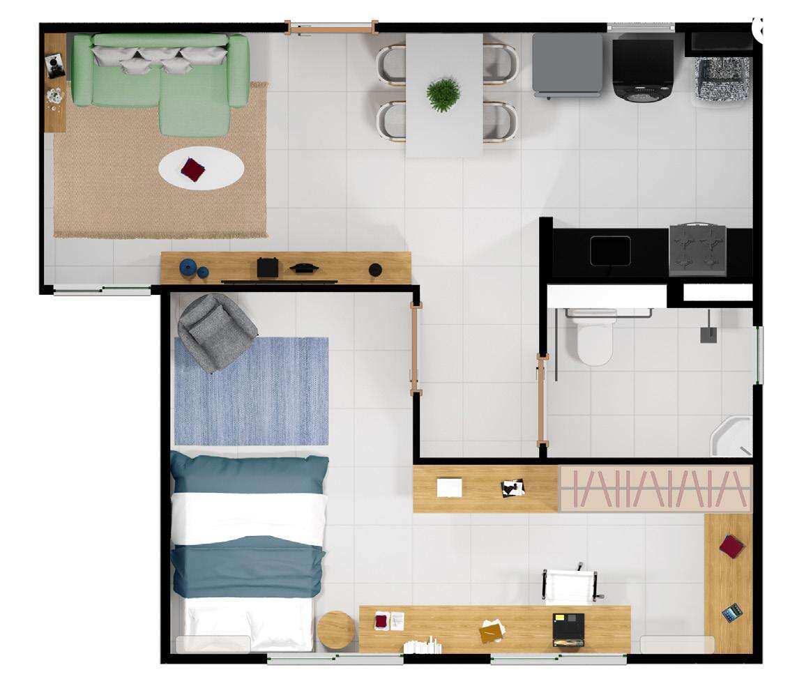 Com apartamentos de 44,42 m², oferece um espaço bem distribuído, com 2 quartos, sala de estar/jantar, cozinha, banheiro social e área de serviço. Além disso, as unidades térreas contam com a opção de garden, um jardim privativo que amplia seu espaço de conforto, aproveitando seu apartamento como se fosse uma aconchegante casa, acrescentando uma churrasqueira ou piscina de forma privativa. Unidades com opções de 1 ou 2 vagas de garagem.